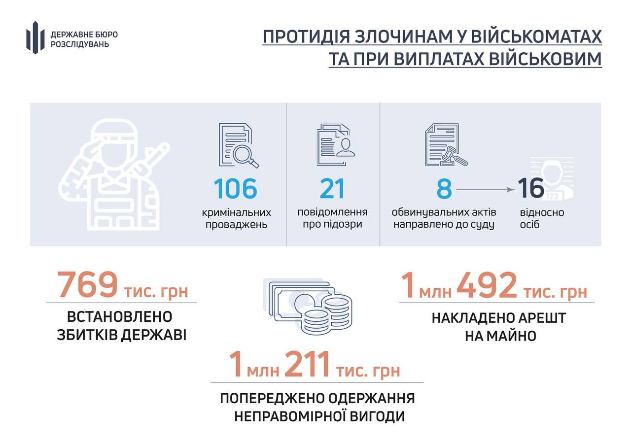🔹 З початку війни ДБР розслідує 106 кримінальних провадження щодо порушень під час роботи територіальних центрів комплектування та військово-лікарських комісій. За результатами цієї роботи 21 особі повідомлено про підозру, до суду направлено 8 обвинувальних актів щодо 16 осіб.