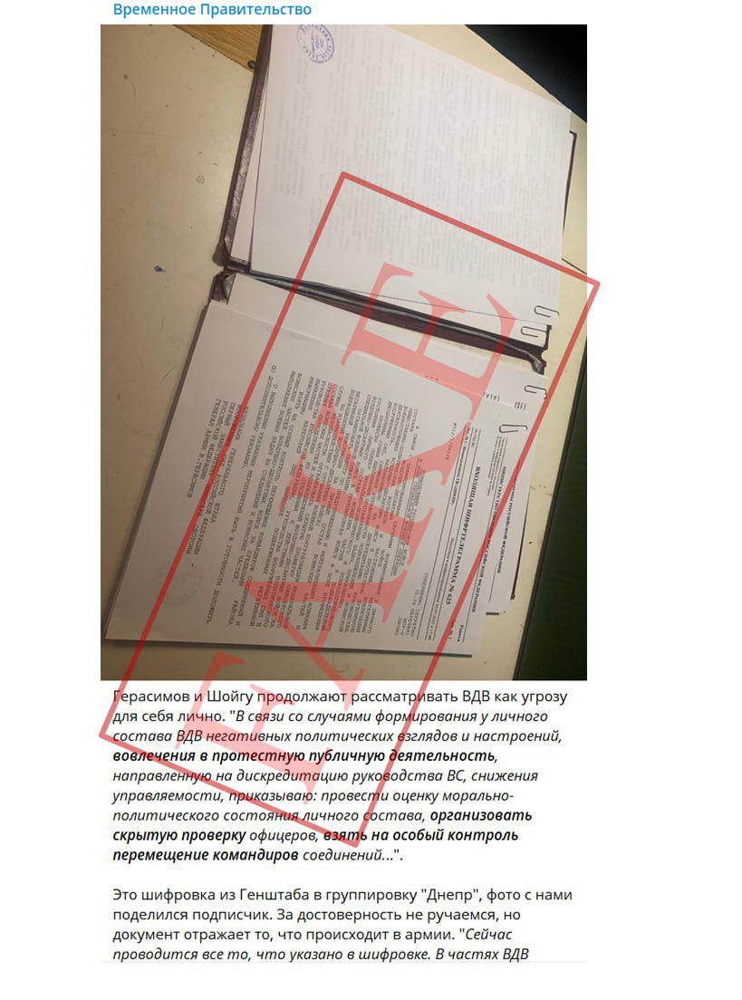 В телеграмме пытаются распространить шифртелеграмму, которую якобы, по словам канала «Временное Правительство» отправил Начальник ГШ ВС РФ Герасимов.