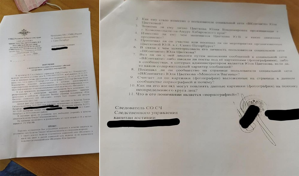 Согласно поручению, которое подал комсомольский следователь, Булатова допросят о том, как он узнал о Цветковой, посещал ли ее паблик «Монологи вагины» и считает ли выложенные там картинки порнографическими. Показания гомофоба будут приобщены к уголовному делу по части 3 статьи 242 УК РФ, которое завели еще в прошлом году.