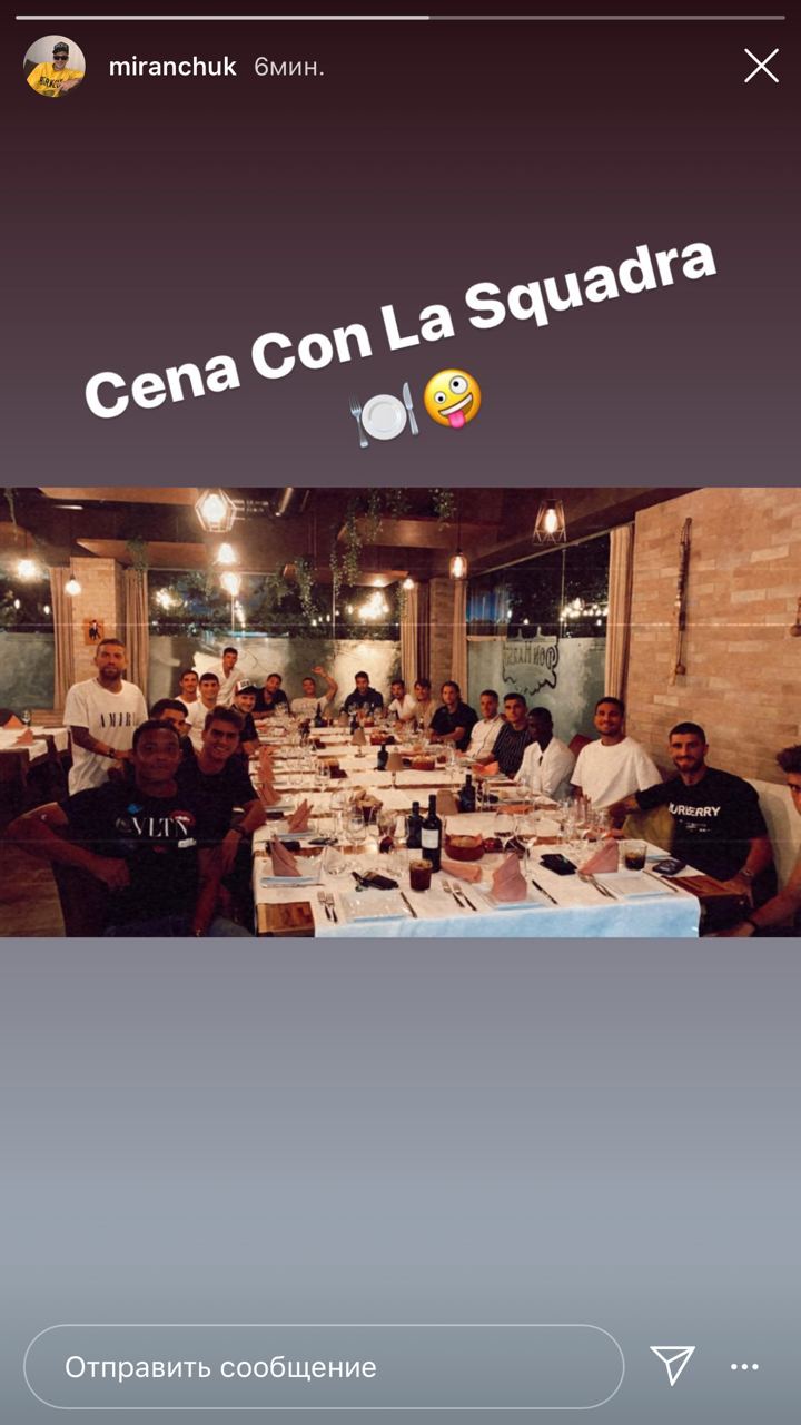 Среди тех, кто пульнул фотку с клубной посиделки к себе в инст, оказался и Алексей Миранчук, который в матче не играл и сейчас продолжает восстанавливаться от травмы. “Cena con la squadra”, – подписал кадр россиянин, что значит командный ужин. Кстати, смогли найти Лёху?