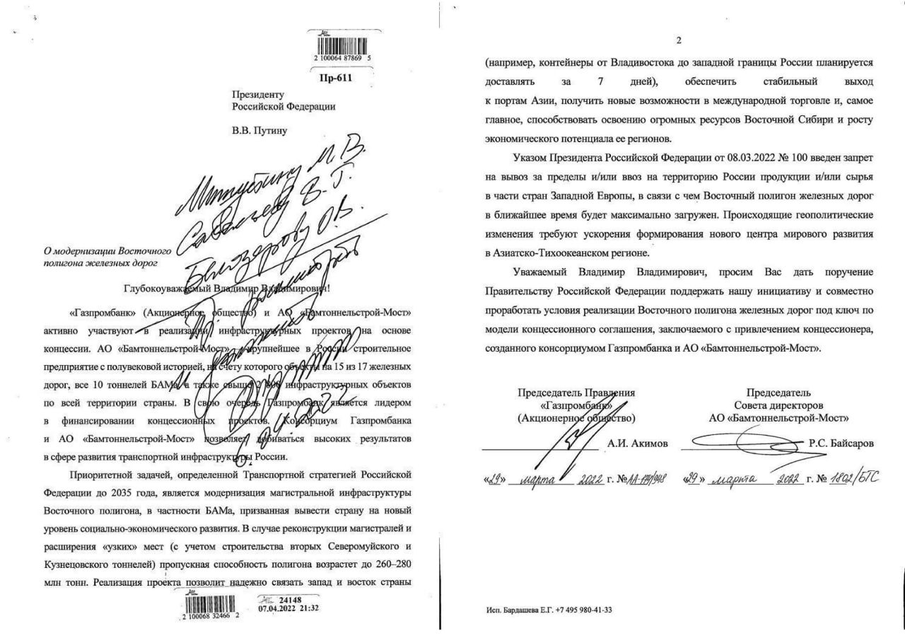 Сама идея родилась еще весной этого года. «Газпромбанк» и «Бамтоннельстрой-Мост» обратились лично к президенту Владимиру Путину, а тот поручил «рассмотреть [предложение] и доложить» премьер-министру Михаилу Мишустину, главе Минстранса Виталию Савельеву и главе РЖД Олегу Белозерову (письмо прилагаем).