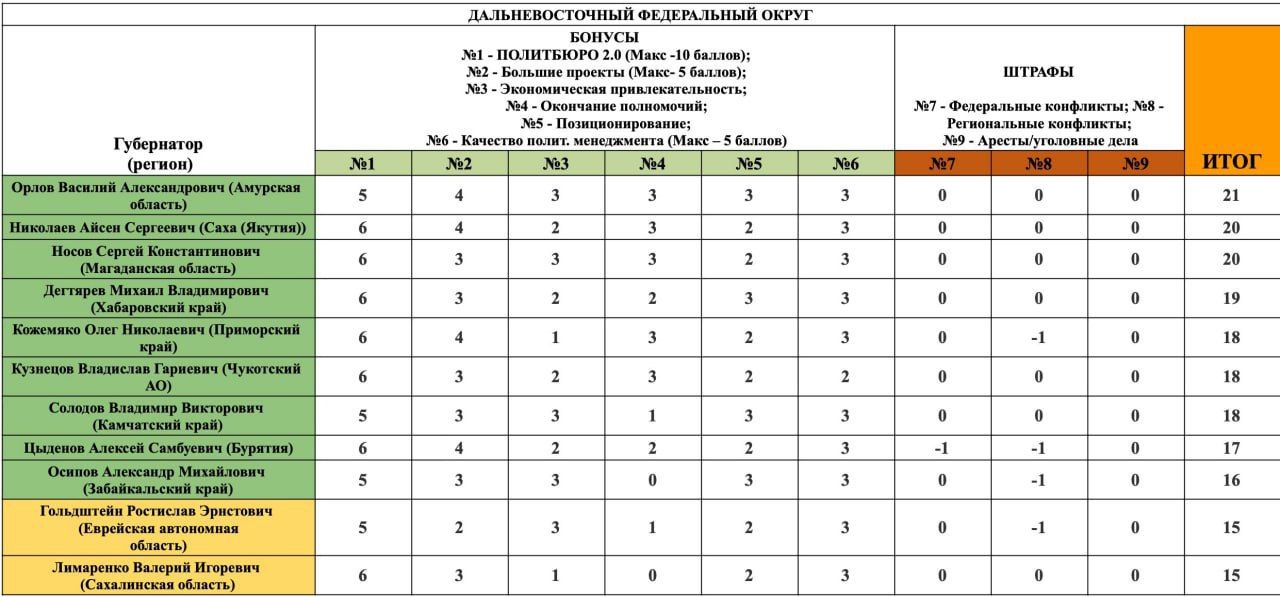 📊 Приведенных выше губернаторов аналитики рассматривали по девяти критериям. Среди них: