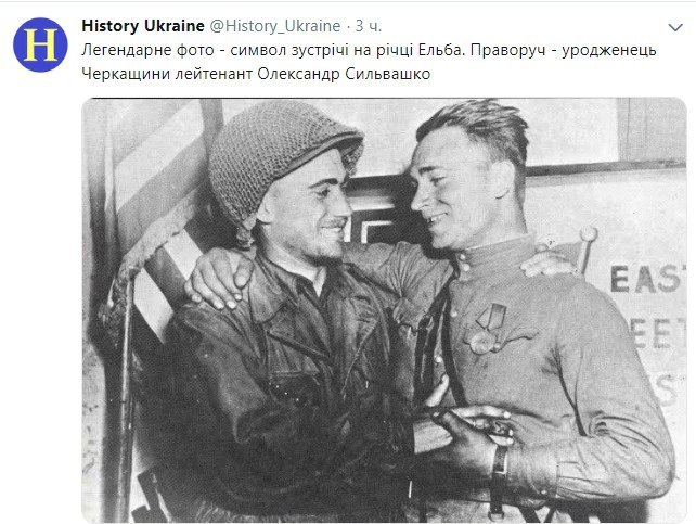 Счастливые, дарящие надежду улыбки встретившихся на полуразрушенном мосту на середине Эльбы в районе города Торгау командира взвода 58-й гвардейской стрелковой дивизии Александра Сильвашко и командира разведгруппы 69-й американской пехотной дивизии Уильяма Робертсона - символ ЕДИНЕНИЯ в борьбе с нацизмом.