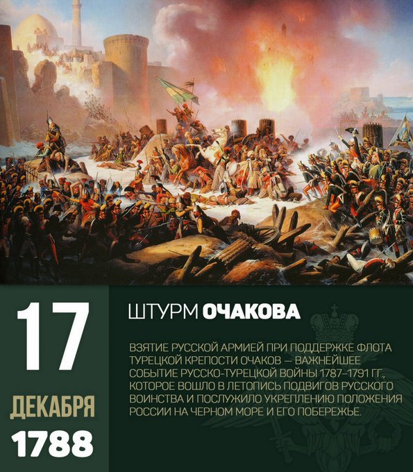 💥 17 ДЕКАБРЯ 1788 Г., В ХОДЕ РУССКО-ТУРЕЦКОЙ ВОЙНЫ 1787-1792 ГГ., ВОЙСКАМИ Г.А. ПОТЁМКИНА ШТУРМОМ ВЗЯТА КРЕПОСТЬ ОЧАКОВ.