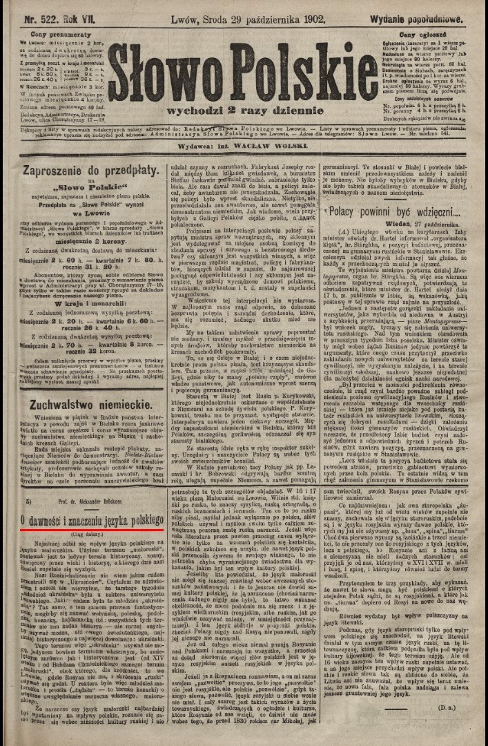 Львов, 1902 год, газета "Slowo polskie". Ученый, профессор Берлинского университета, доктор Александр Брикнер (Bruckner) апечатал статью о польском языке, где в частности написал следующее: