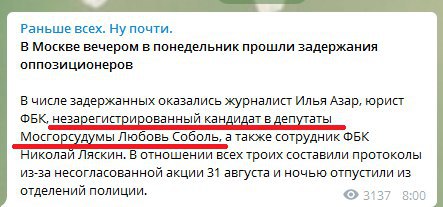 "........незарегистрированный кандидат в депутаты Мосгорсудумы Любовь Соболь" - это теперь должность такая или что? Тогда я - ......"Выпускинк МГУ не принятый в университет по приине неуспеваемости" или это вот "Космонавт, не ставший космонавтом, потому-что не прошел медкомиссию".