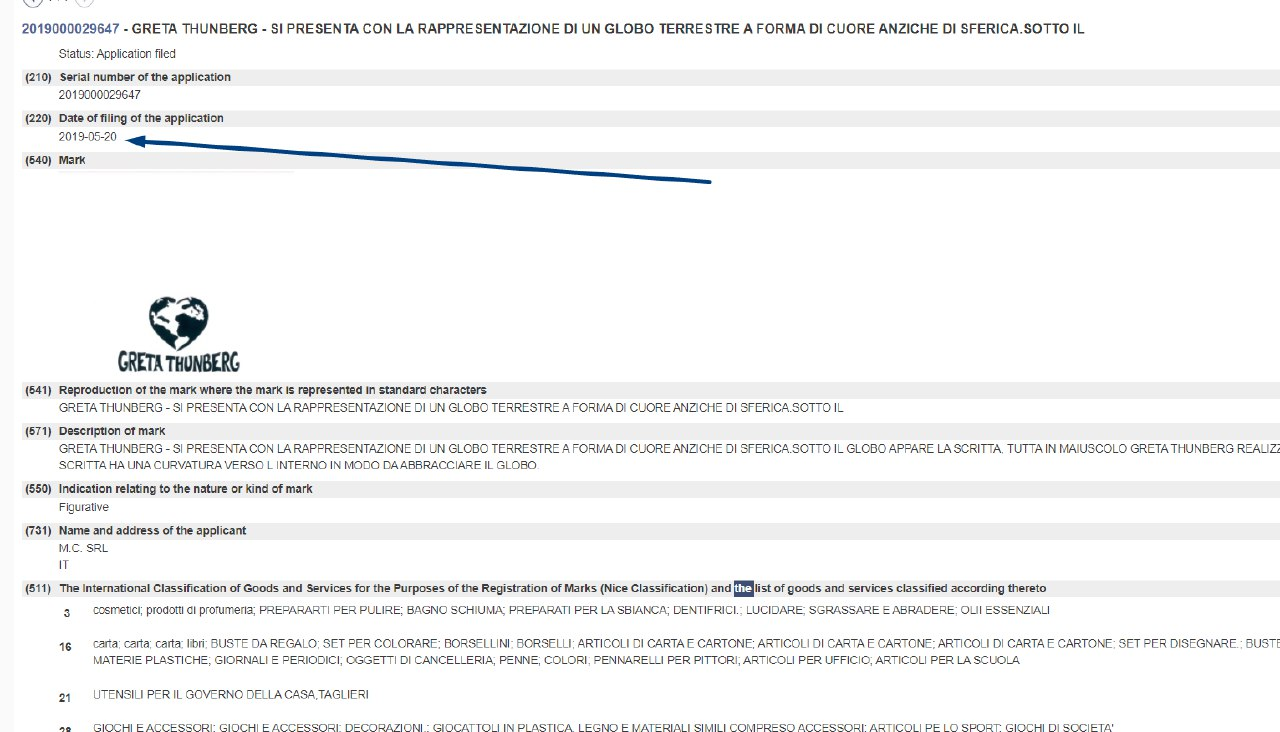 В Европейское ведомство по интеллектуальной собственности (EUIPO) поступили три заявки от её фонда на регистрацию товарных знаков с именем Греты и названием её эко-движения «FRIDAYS FOR FUTURE» или «SKOLSTREJK FÖR KLIMATET».