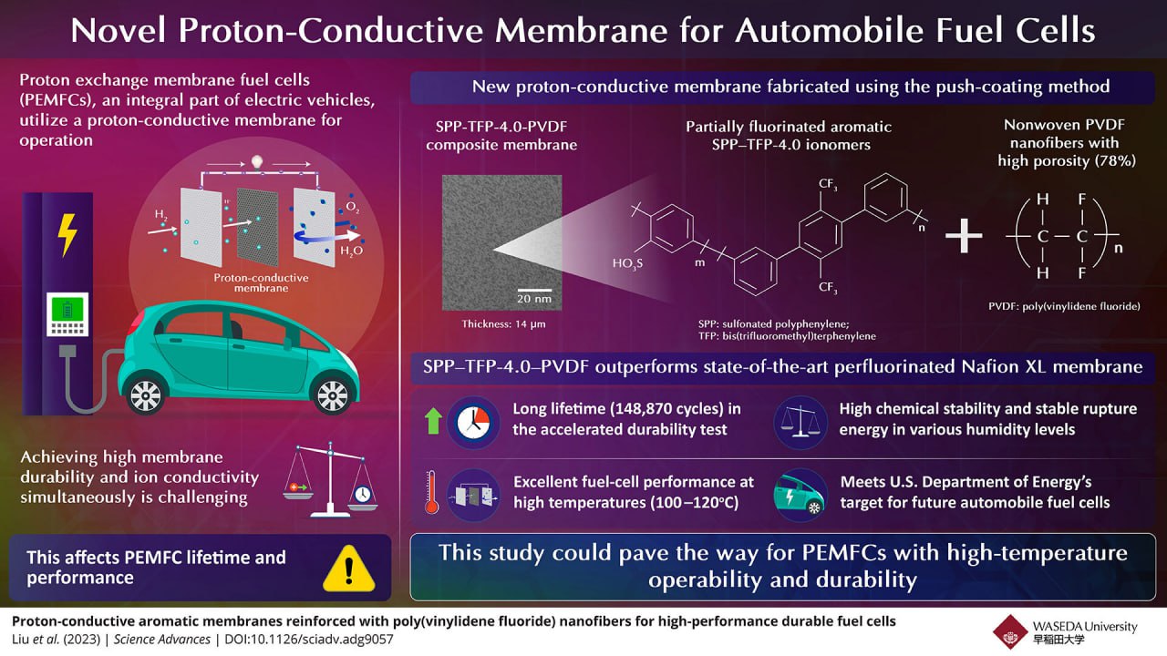 У автомобильных топливных элементов существует проблема с долговечностью и ионной проводимостью протонпроводящих мембран: это две характеристики взаимоисключающие. Однако ученые из Японии под руководством профессора Кендзи Миятаке из Университета Васэда и Университета Яманаси разработали новые протон-проводящие мембраны, которые потенциально могут решить эту проблему.