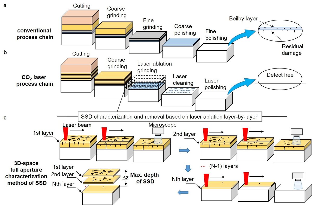 Новая статья, опубликованная в журнале Light: Advanced Manufacturing, описывает новую технологическую цепочку, разработанную учеными под руководством профессора Чаояна Вэя и Цзянды Шао, которая позволяет изготавливать оптику из плавленого кварца с высокой устойчивостью к повреждениям. Это важное достижение, поскольку остаточные дефекты обработки значительно снижают порог лазерно-индуцированного повреждения оптики из кварцевого стекла (LIDT), что ограничивает ее производительность и срок службы в приложениях с высокоэнергетическими лазерами.