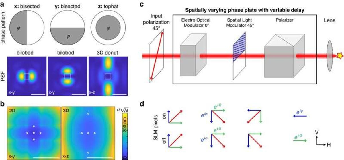 Исследователи разработали новый способ создания спроецированного пучка света для MINFLUX. Этот метод комбинирует два более простых устройства: пространственный модулятор света (SLM) и электрооптический модулятор (EOM). SLM действует как цифровой проектор, манипулируя световыми паттернами, а EOM контролирует интенсивность света. Это устройство значительно быстрее, дешевле и проще в использовании, чем традиционные методы.