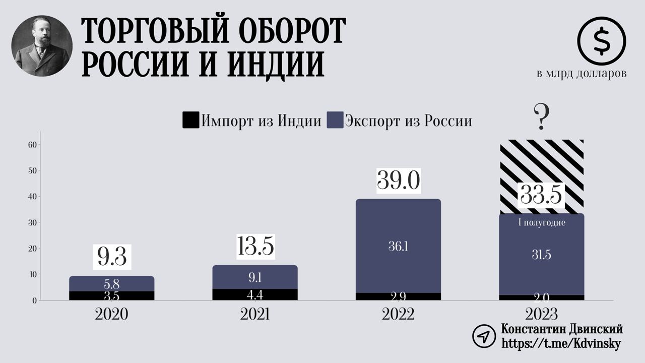 Для начала необходимо понять, сколько рупий действительно застряло в Индии? Западные СМИ приводят цифру в 39 млрд долларов. Нельзя исключать, что американцы в свойственном им стиле несколько сгустили краски. В 2022 году экспорт России в Индию составил 36,1 млрд долларов, за первые 6 месяцев 2023 года - ещё 31,5 млрд. Итого 67,6 млрд долларов.