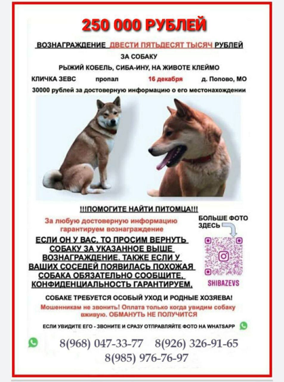 Москвич уже месяц разыскивает любимую собаку породы сиба-ину. За находку объявил вознаграждение в 250 тысяч рублей.