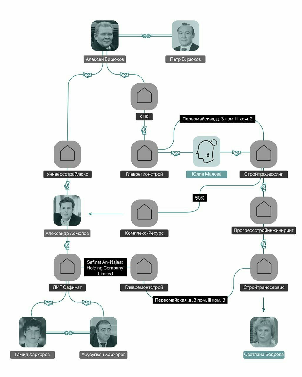 Russian Deadline обнаружил, что записанные на уборщицу компании связаны с бизнесом семьи вице-мэра Москвы Петра Бирюкова и бывшего зампреда правительства Дагестана Абусупьяна Хархарова.