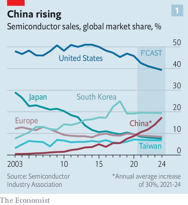 Полупроводники — новая нефть. Угадайте, кто, по прогнозам The Economist (делим на два), выиграет, а кто потеряет долю рынка?