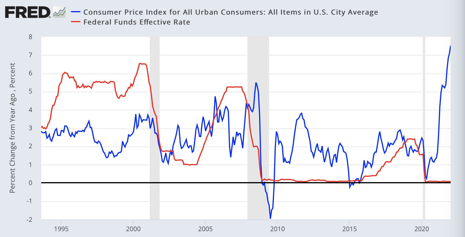 4) Реальная ставка по фондам #ФРС минус 7,4% самая низкая с 1974 года. Фьючерсы на федеральные фонды поднялись до 50% вероятности повышения базовой ставки на 50 б.п. в марте
