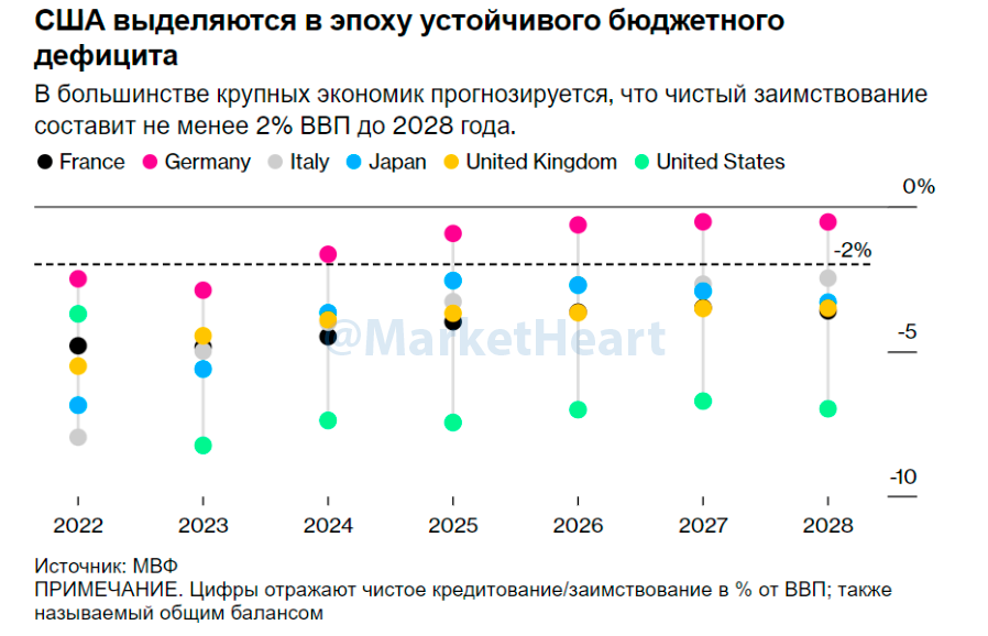 – «Ралли рынка облигаций игнорирует растущую проблему долга в 2 триллиона долларов. Сейчас годовой дефицит США составляет 6% ВВП, что примерно вдвое превышает историческую норму», BBG