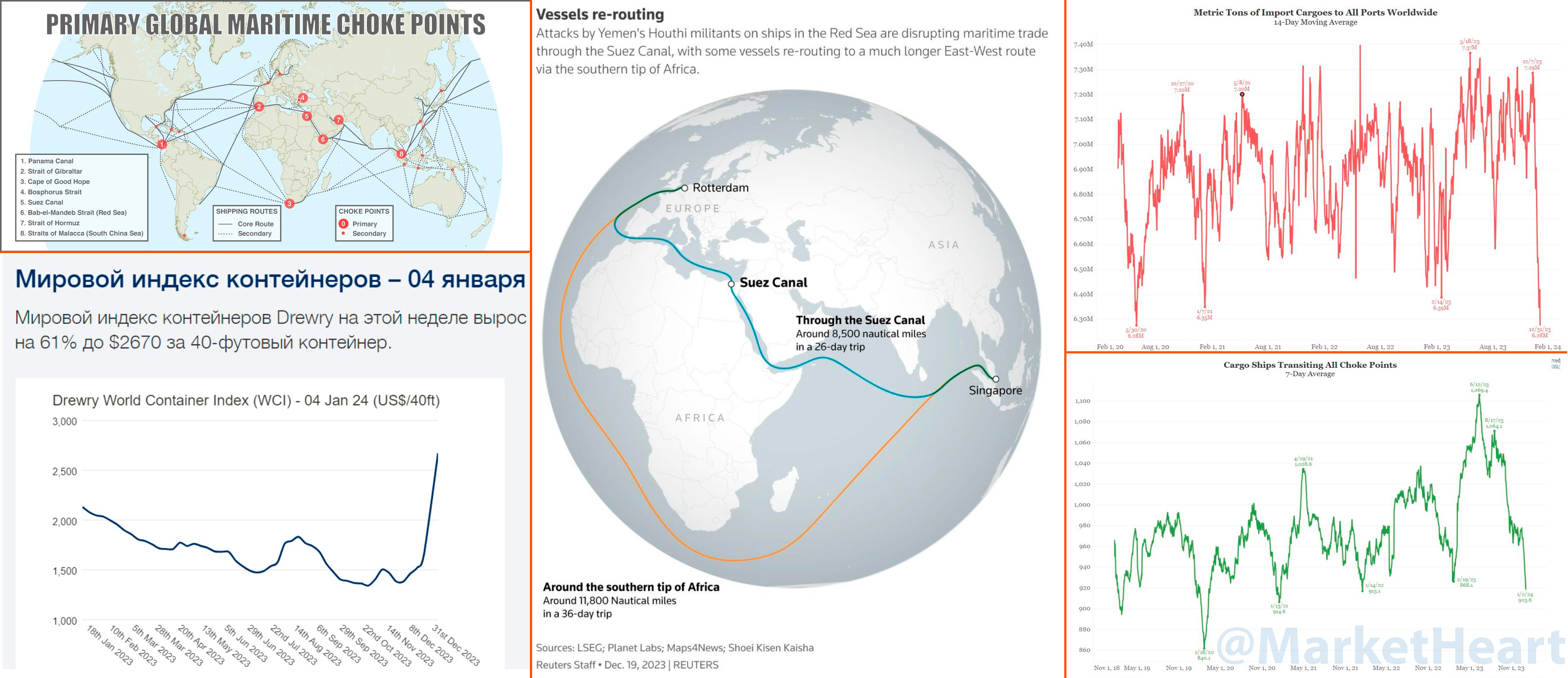 – Красное море: 12-15% мирового судоходства (Суэцкий канал, Баб-эль-Мандебский пролив). Трафик грузовых судов упал на 50% к ноябрю, танкеров на 20-30%. Страховка на маршруте выросла на 300–500%. К слову, пока чутка не дотягиваем по цифрам до кейса блокировки Суэца контейнеровозом «Эвер Гивен» в марте 2021 года, но все впереди, а Египет теряет около $10 млн из-за падения транзита.