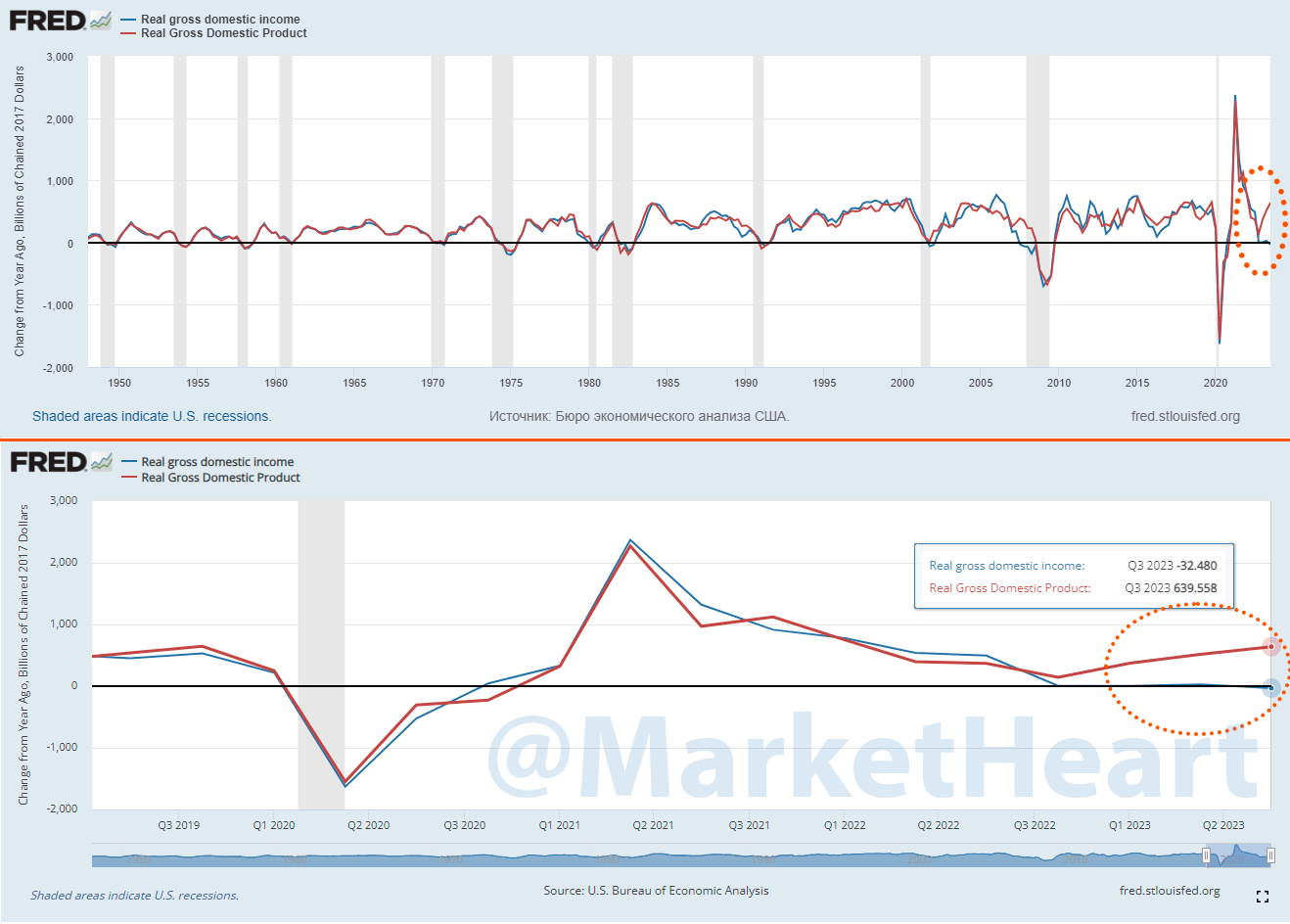 Иногда разрыв между ВВД и ВВП фиксируются за периодами рецессий, но не в таких масштабах. ВВД зачастую более корректен, а его сокращение г/г всегда подтверждает начало рецессии в экономике. В данном случае постфактум.
