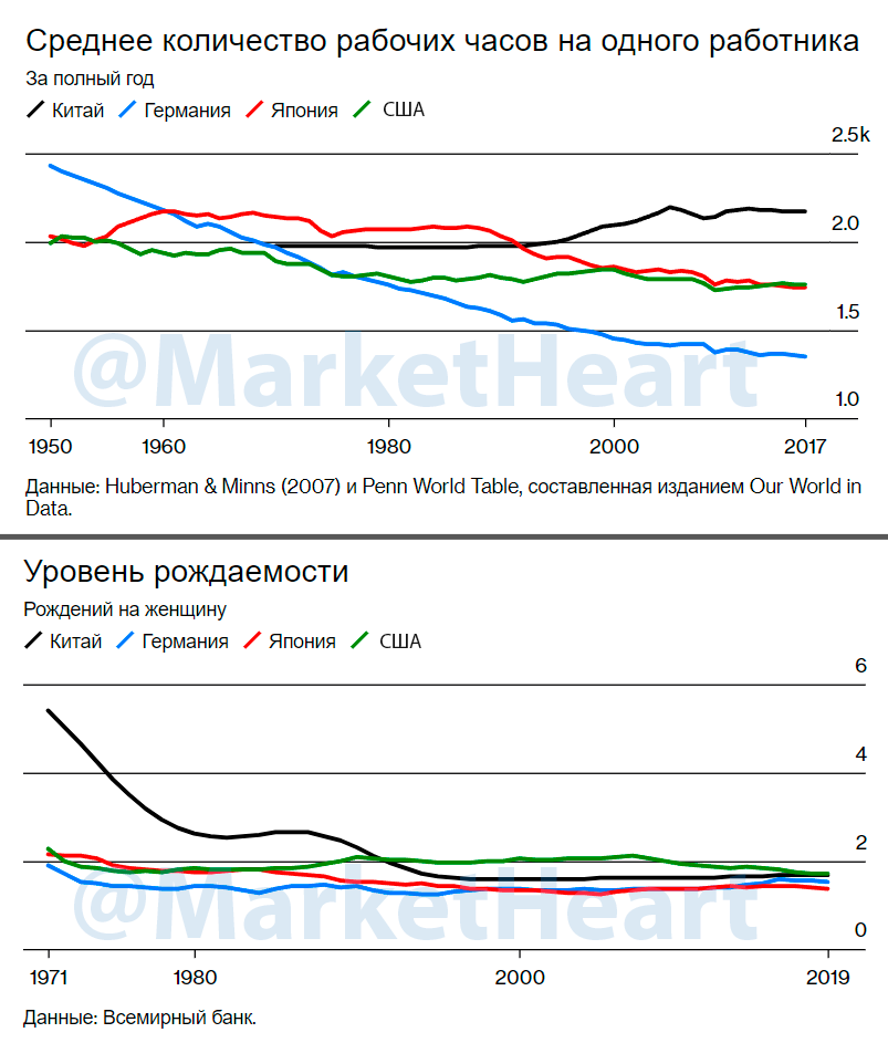 👇🏻 Ниже данные по среднему кол-ву рабочих часов и уровню рождаемости в Китае, Германии, Японии и США