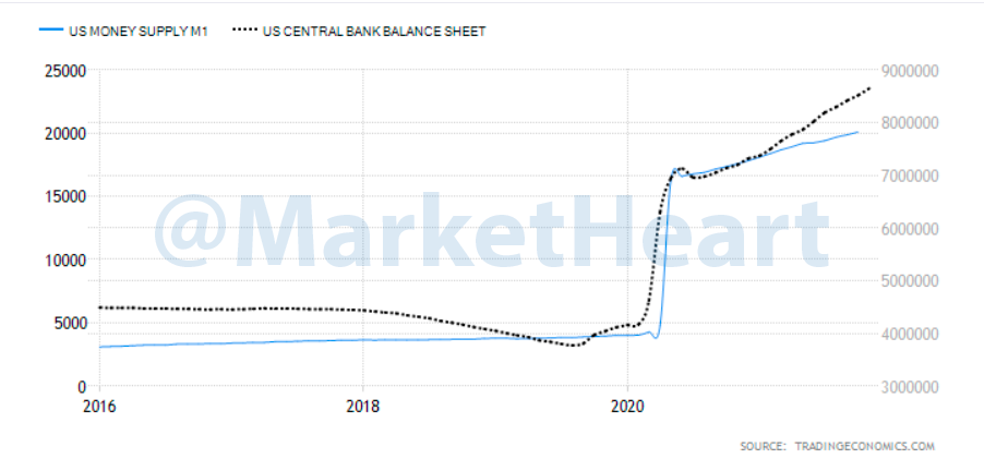 Теперь давайте разберемся с агрегатором денежной массы M1, который взят из другого еженедельного отчета ФРС. Именно здесь начинается путаница, как M1 относится к QE.