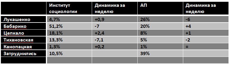 Институт социологии НАН и БИСИ продолжают еженедельные замеры рейтингов основных претендентов на пост президента. Мы уже отмечали, что данные, которые поступают к нам из института, кардинально отличаются от тех, что попадают потом в АП РБ. Решайте сами, каким верить.