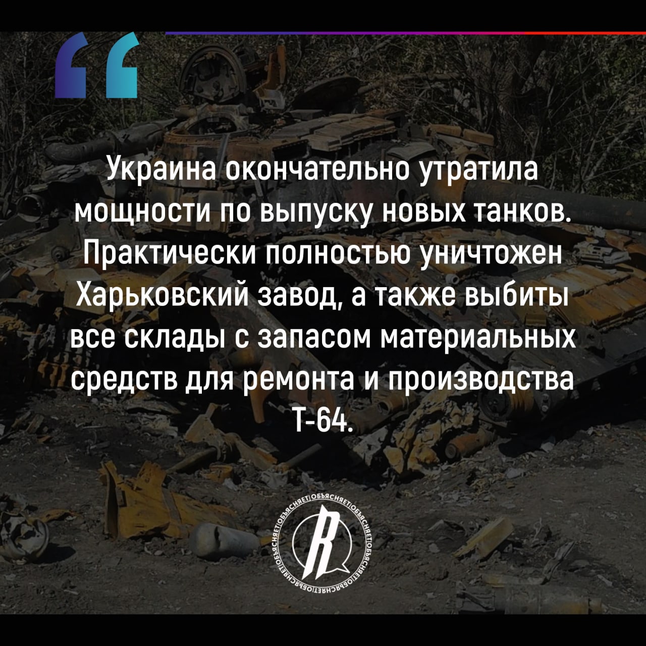 Потеря почти всего парка транспортных вертолётов, видимо, и стала причиной поставки США вертолётов Ми-17, ранее приобретённых американцами для ВВС Афганистана. В целом, анализируя список техники, запрошенной в рамках западной военной помощи, можно сделать вывод и о потерях и дефиците тех или иных позиций в ВСУ. Особой строкой здесь идут танки Т-72. По имеющимся данным, Чехия и Польша передали Украине около 250 танков для возмещения уничтоженных в боях Т-64. При этом, до войны ВСУ имели около 2500 танков, в том числе и находящиеся на хранении. По имеющимся данным, в настоящий момент способны к использованию лишь 30% от этого числа. Это вызвано не только потерями танков в бою, но уничтожением баз хранения. Также Украина окончательно утратила мощности по выпуску новых танков. Практически полностью уничтожен Харьковский завод, а также выбиты все склады с запасом материальных средств для ремонта и производства Т-64.