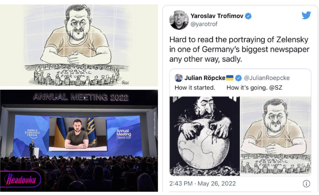 Карикатура была опубликована в крупном немецком издании Süddeutsche Zeitung — она посвящена выступлению Зеленского на экономическом форуме в Давосе. На ней украинский президент, не устающий напоминать о своем происхождении, изображен в виде огромной фигуры, нависающей над прочими крошечными участниками форума. Критики считают, что карикатура отсылает к конспирологическим теориям о еврейском заговоре и нацистской антисемитской пропаганде.