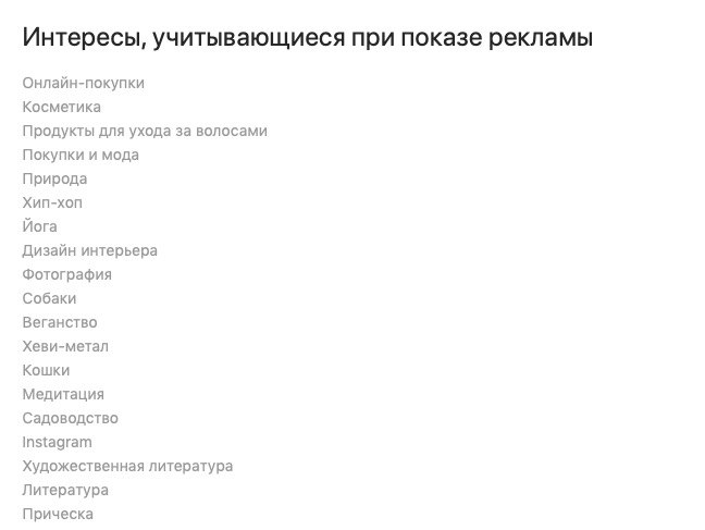 Мои «интересы» на скриншоте. Список бесконечен. Все, чему я ставила лайки, переходила по ссылке, наверное, даже смотрела дольше двух секунд, - учтено, протегировано и работает в интересах рекламодателей 🔊