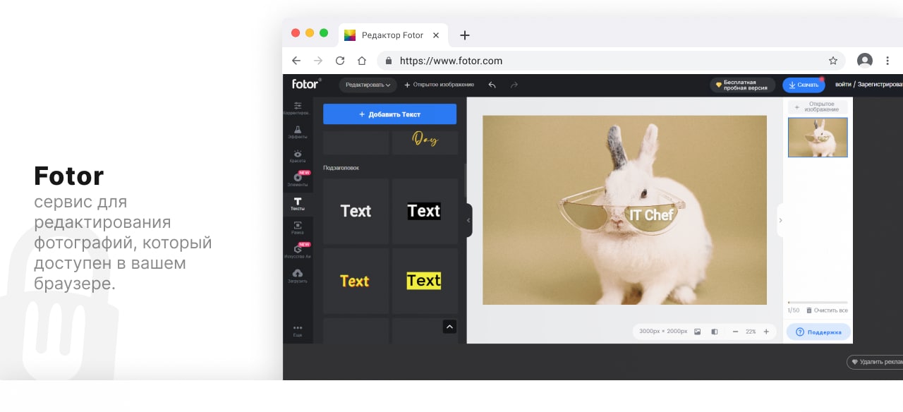 Fotor — сервис для редактирования фотографий, который доступен прямо в браузере. С помощью сервиса можно обрезать изображения, менять их размер, добавлять текст к фотографиям, а также легко создавать фотоколлажи и графические дизайны.