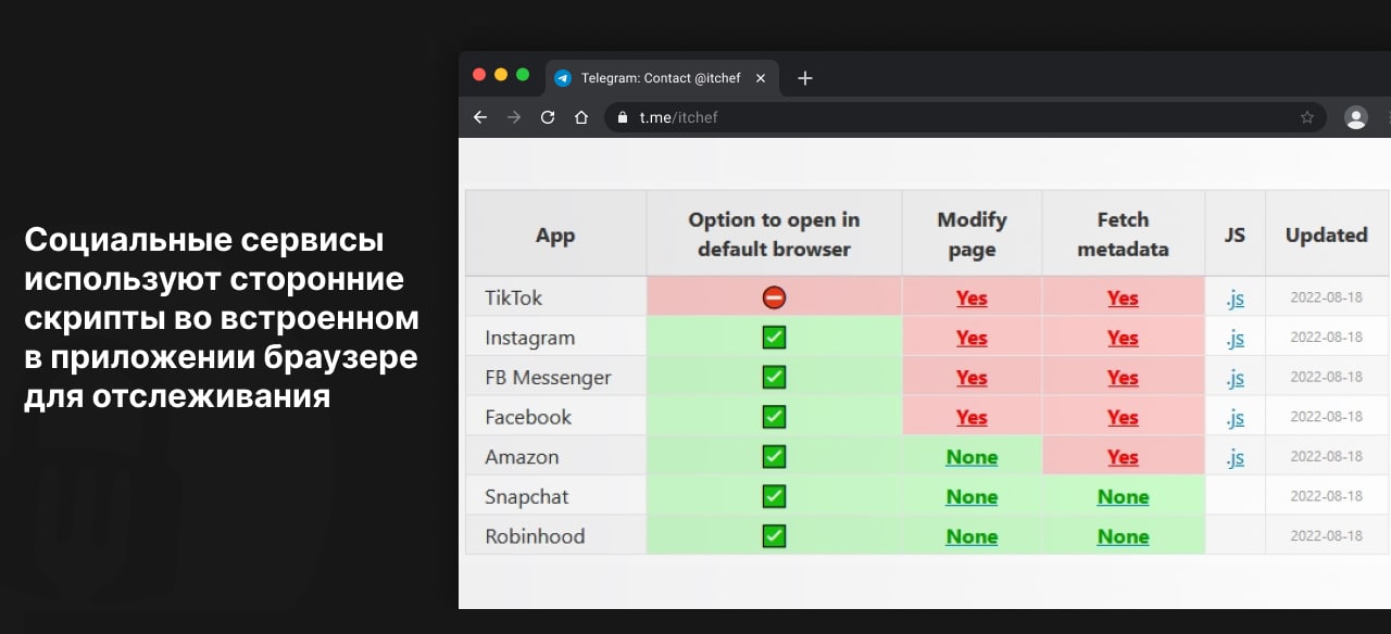 TikTok и другие социальные сервисы используют сторонние скрипты во встроенном в приложении браузере для отслеживания