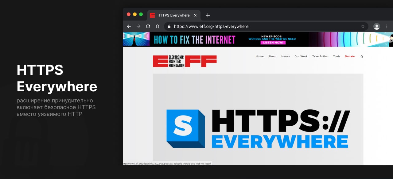 Но мы ведь тоже не пальцем деланные: в этом случае можно просто воспользоваться HTTPS Everywhere. Расширение будет принудительно включать безопасное HTTPS вместо уязвимого HTTP.