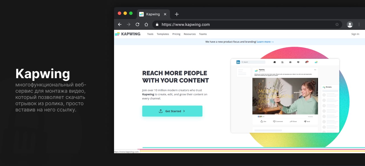 Kapwing — многофункциональный веб-сервис для монтажа видео, который позволяет скачать отрывок из ролика, просто вставив на него ссылку. Единственным минусом является то, что без подписки максимальное качество для экспорта ограничено 1280x720.