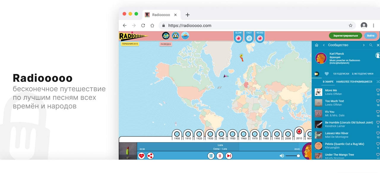 Главная особенность онлайнового сервиса Radiooooo состоит в том, что он стирает границы пространства и времени. Выберите на карте любую страну, укажите с помощью кнопок на нижней панели нужное десятилетие. Сразу же начнётся воспроизведение песен, популярных в этом регионе в данное время.