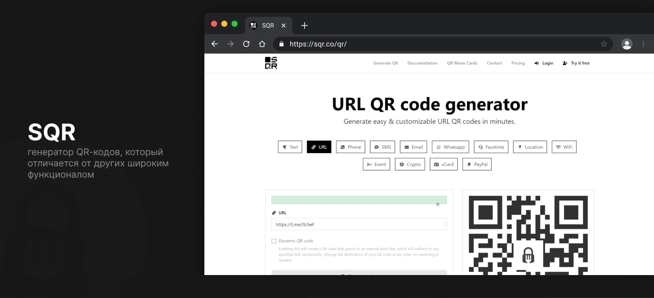 SQR — генератор QR-кодов, который отличается от других широким функционалом. Для внедрения в код доступно огромное множество вариантов, таких как PayPal, различные переводы, звонки и так далее.