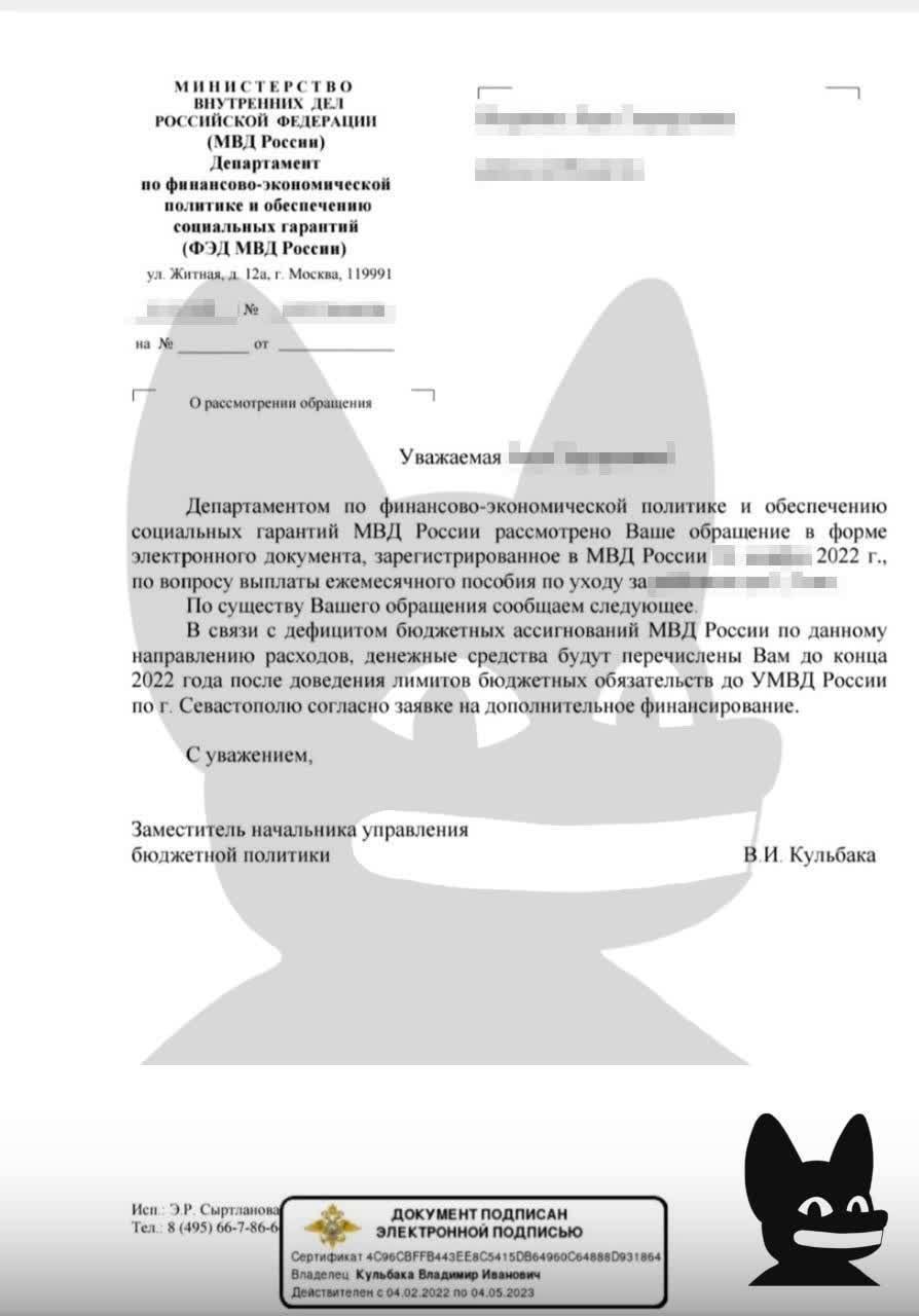 “В связи с дефицитом бюджетных ассигнований МВД РФ по данному направлению расходов, денежные средства будут перечислены Вам до конца 2022 года после доведения лимитов бюджетных обязательств до УМВД России по Севастополю согласно заявке на дополнительное финансирование”.