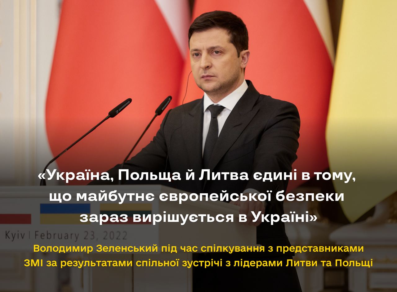 Президент України Володимир Зеленський під час зустрічі з Президентом Республіки Польща Анджеєм Дудою та Президентом Литовської Республіки Гітанасом Наусєдою обговорили наслідки дій Російської Федерації для європейської та регіональної безпеки й скоординували зусилля з метою протидії російській агресії. Про це Глава Української держави заявив представникам ЗМІ за результатами спільної зустрічі з лідерами Литви та Польщі.