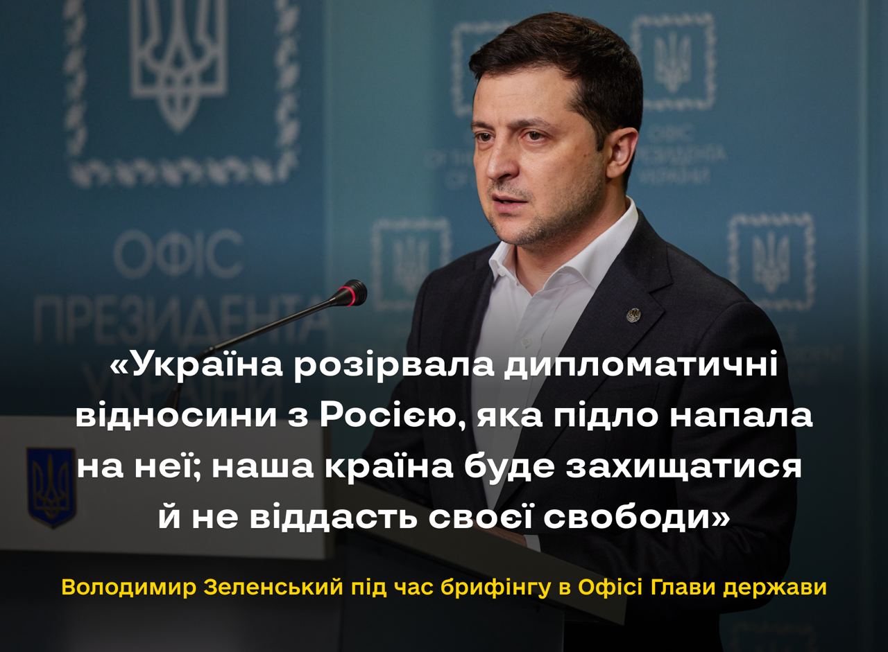 Держава Україна розірвала дипломатичні відносини з Російською Федерацією, яка підло напала на неї о 5-й ранку 24 лютого. Про це заявив Президент України Володимир Зеленський на брифінгу в Офісі Глави держави.