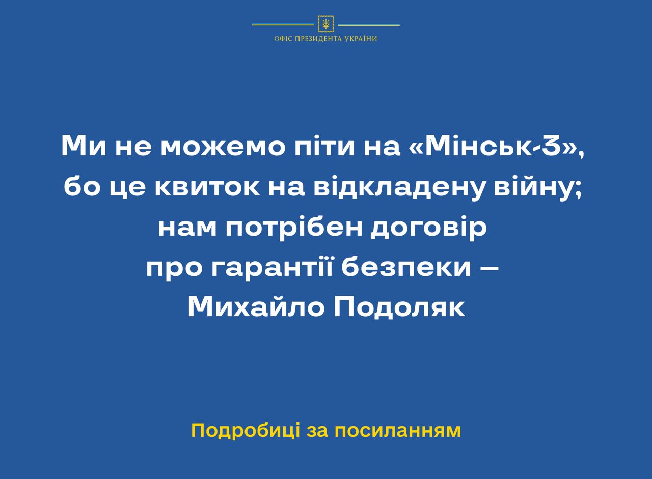 Будь-який договір між Україною та Російською Федерацією на кшталт «Мінська-3» – це відкладена війна, яка принесе набагато більше жертв і ризиків для існування нашої держави. Водночас укладення договору про гарантії безпеки – це питання правильного закінчення війни у Європі. Про це сказав радник керівника Офісу Президента України, член української делегації на перемовинах з Росією Михайло Подоляк в інтерв’ю LB.ua.