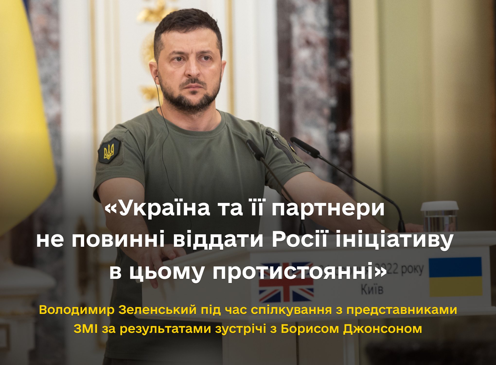 Сьогодні демократичний світ перехопив ініціативу в протистоянні з країною-агресором, тож потрібно зберігати єдність, щоб не втратити її та здобути перемогу у війні, яку Росія розв’язала в Україні. Про це заявив Президент Володимир Зеленський під час спілкування з представниками ЗМІ за результатами зустрічі з Прем’єр-міністром Великої Британії Борисом Джонсоном у Києві.