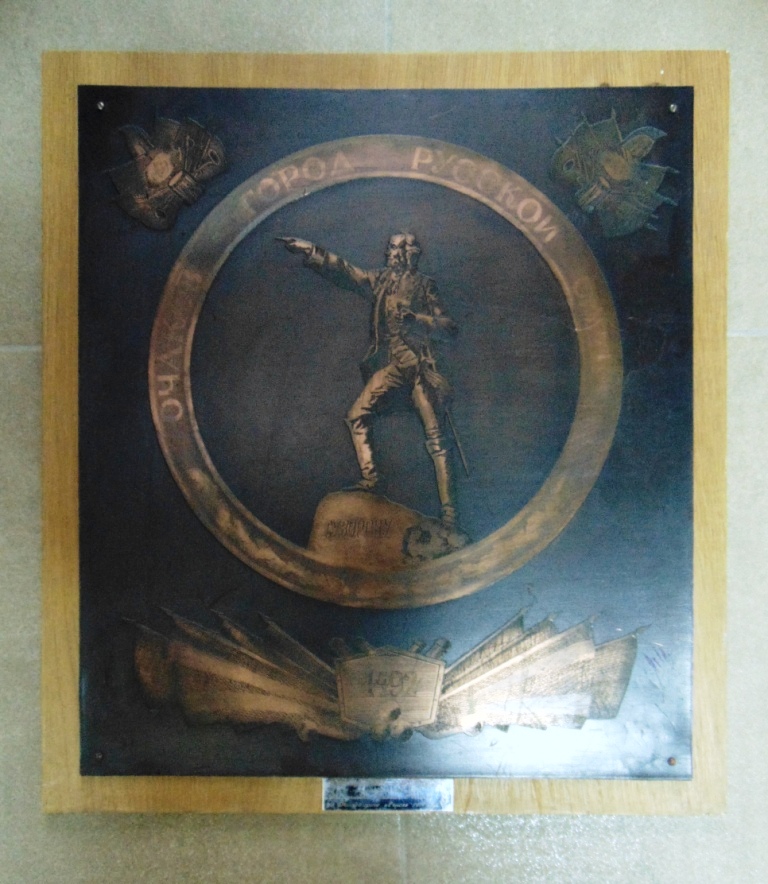 Памятный сувенир - художественное литье в виде памятника А.В.Суворову. По кругу надпись "Очаков - город Русской Славы", внизу развернутые знамена, на щите дата 1492, в верхней части слева и справа атрибуты военного времени.