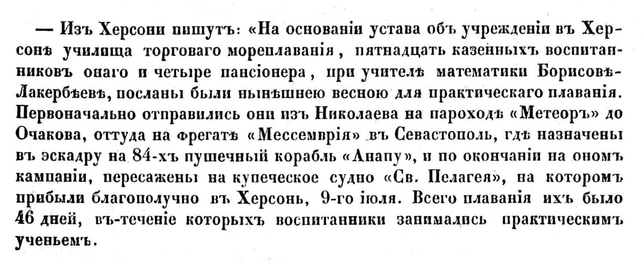 - Из Херсона пишут: "На основании устава об учреждении в Херсоне училища торгового мореплавания, пятнадцать казенных воспитанников оного и четыре пенсионера, при учителе математики Борисове-Лакербееве, посланы были нынешнею весною для практического плавания. Первоначально отправились они из Николаева на пароходе "Метеор" до Очакова, оттуда на фрегате "Мессемврия" в Севастополь, где назначены в эскадру на 84-х пушечный корабль "Анапу", и по окончании на оном компании, пересажены на купеческое судно "Св. Пелагея", на котором прибыли благополучно в Херсон, 9-ого июля. Всего плавания их было 46 дней, в течение которых воспитанники занимались практическим ученьем.