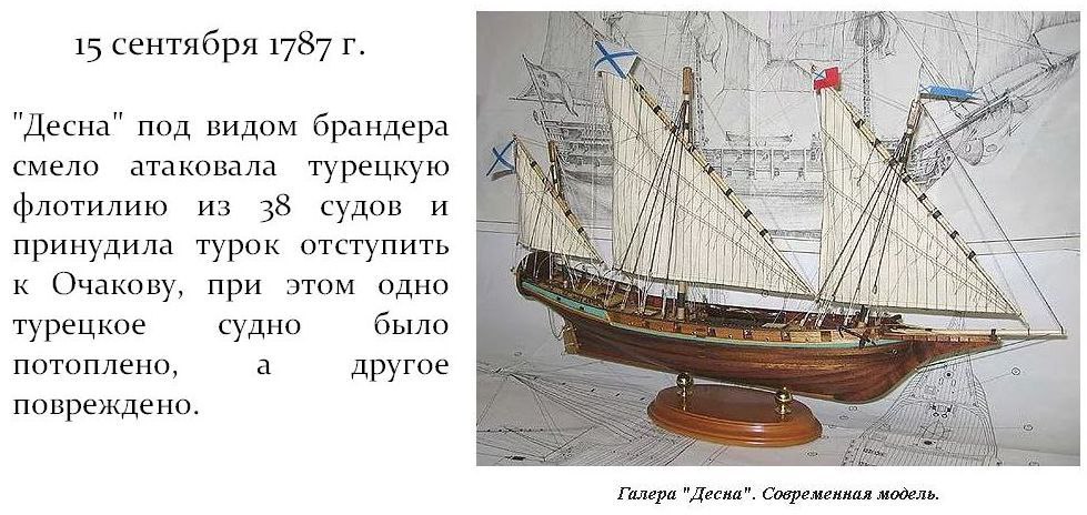 📖 15 (26) сентября 1787 г. Во время нападения турецкой флотилии в составе 38 судов на Кинбурн русская галера «Десна» под командой мичмана Ломбарда под видом брандера смело атаковала турецкие суда и принудила их отступить к Очакову; при этом одно турецкое судно было потоплено, другое сильно повреждено.