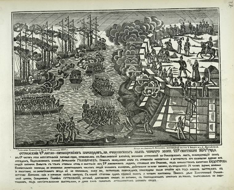 ОТРАЖЕНИЕ 4 АНГЛО-ФРАНЦУЗСКИХ ПАРОХОДОВ НА ОЧАКОВСКОМ МЫСЕ ЧЕРНОГО МОРЯ 22 СЕНТЯБРЯ 1854 ГОДА. Литография размер: 34x42 см.Литография Яковлева E. Крымская война, 1853-1856. Русский народный лубок 1860 -1870 г.г. Отдел искусства, репродукций и фотографий: Нью-Йоркская публичная библиотека.