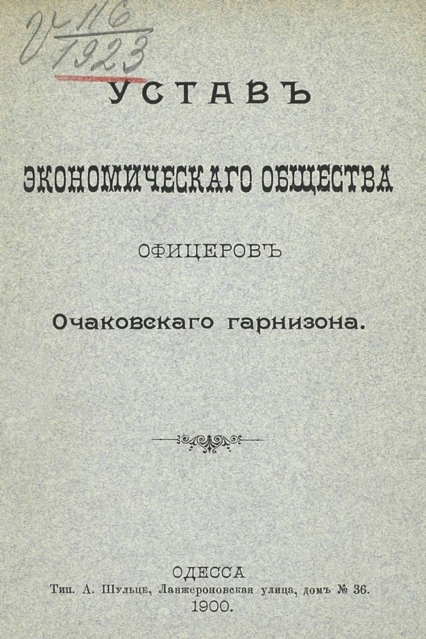Устав Экономического общества офицеров Очаковского гарнизона: утвержденный. 8 декабря 1899 г.. - Одесса, 1900.