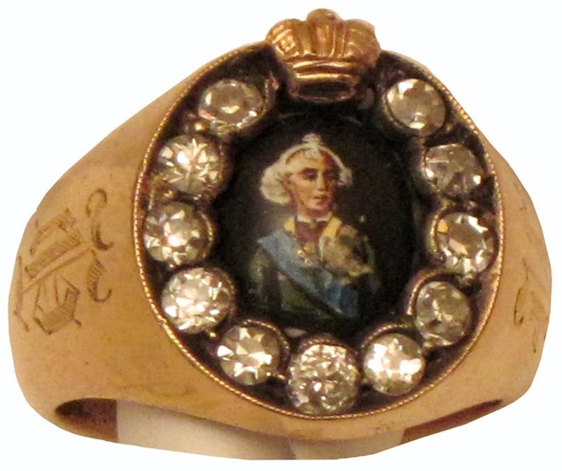 Золотое, гладкое. В центре - медальон овальной формы. На Л.С. медальона на фоне коричневой эмали портрет А.В.Суворова: изображение погрудное, голова 3/4 вправо, одет в зеленый мундир Преображенского полка с голубой лентой ордена св. Андрея Первозванного через правое плечо. Над изображением металлический щиток, символизирующий императорскую корону. Портрет окружен 11 камнями, 8 из которых бриллианты огранки "роза" и 3 камня из стекла (2 справа от изображения и 1 внизу по центру).