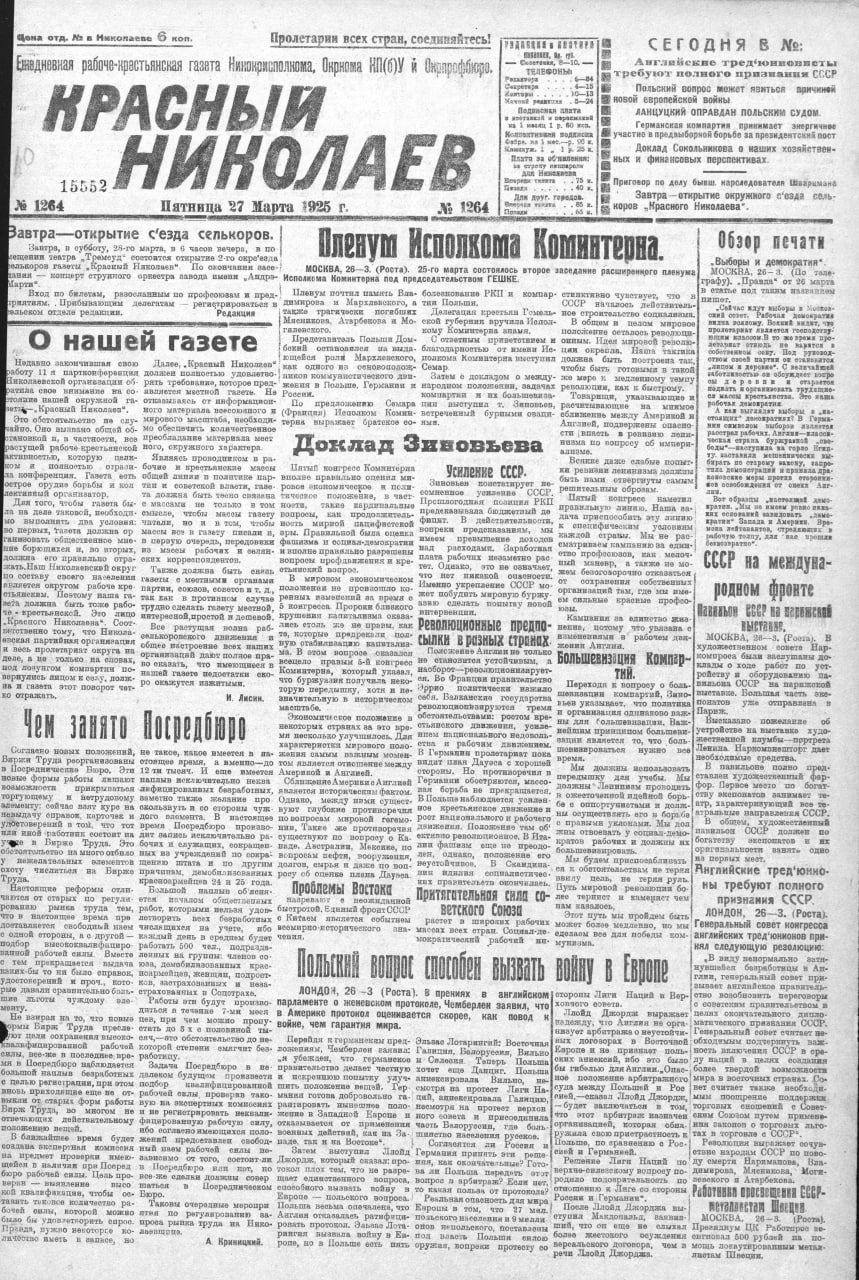 Газета Красный Николаев № 1264 Пятница 27 марта 1925 года.🗓 История Очакова