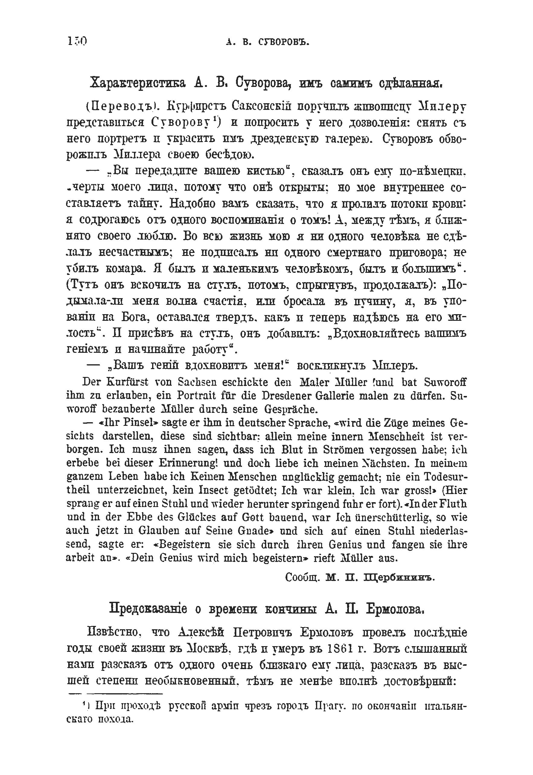 (Перевод). Курфирст Саксонский поручил живописцу Милеру представиться Суворову {При проходе русской армии через город Прагу, по окончании итальянского похода.} и попросить у него дозволения: снять с него портрет и украсить им дрезденскую галерею. Суворов обворожил Миллера своею беседою.