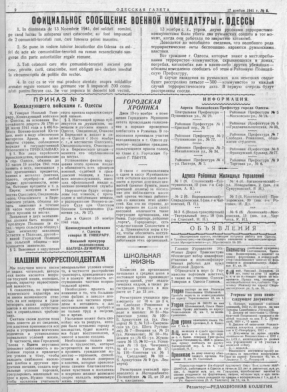 Я, Генерал Николай Гинерару, Командующий войсками г. Одессы, на основании Высочайшего декрета № 1798 от 21 июня 1941 года и § 486 Кодекса Военно-полевой Юстиции, имея в виду обеспечение интересов Армии, в целях защиты страны, соблюдения порядка и государственной безопасности