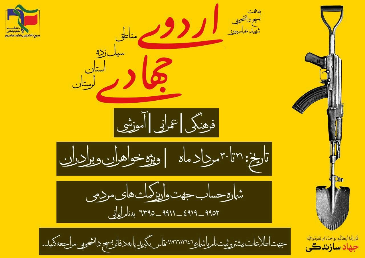 🔶با توجه به وضعیت نامساعد در مناطق سیل زده و نیاز فوری به اقدامات جهادی از برادران و خواهران گرامی دعوت می شود جهت ثبت نام با شماره 09196612646 و یا آیدی @JahadiAbbaspour ارتباط بر قرار فرمایند.