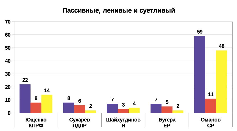 «Ленивые» – вносят на рассмотрение мало законопроектов, и большая часть из них снимается с рассмотрения. Обладают низкой лоббистской эффективностью.